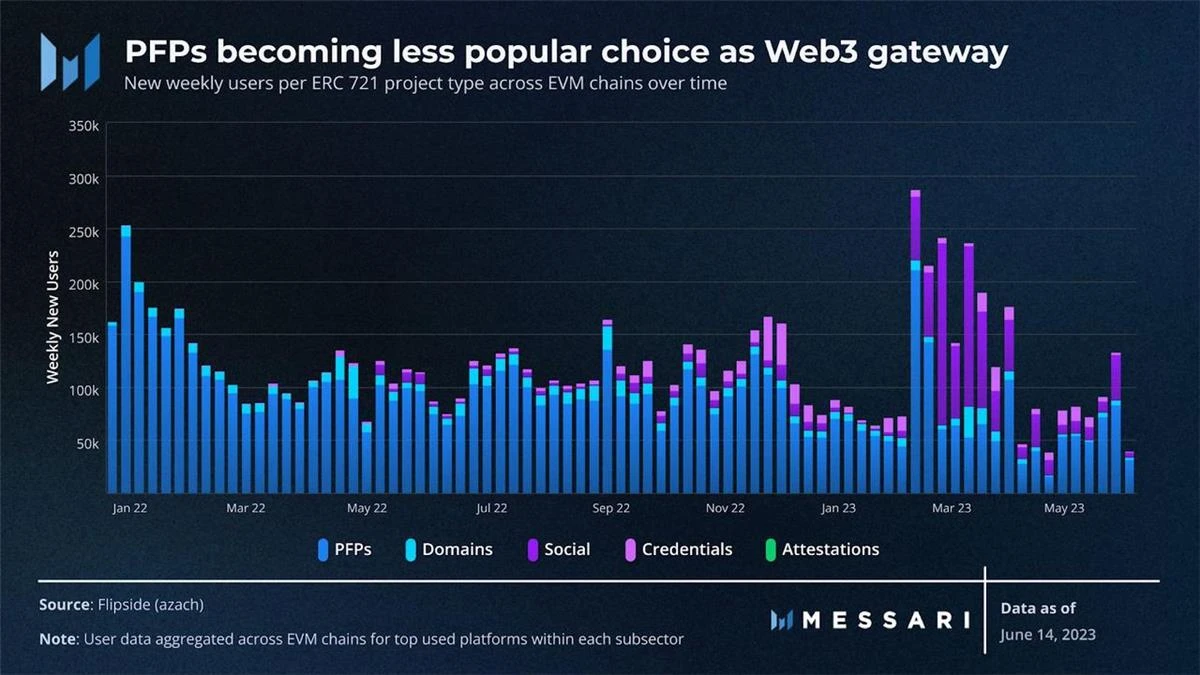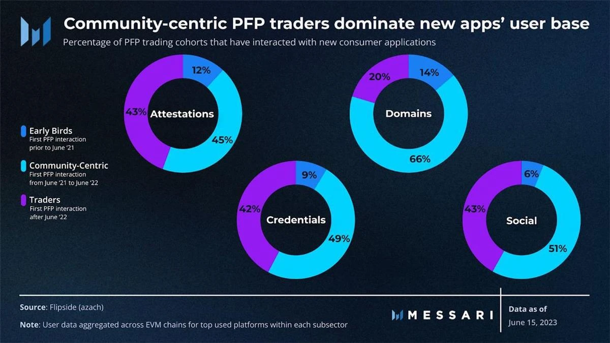 虽然 PFP 的叙事已经发生了变化,但用户仍然寻求建立线上角色。除了社交媒体或身份符号之外,用户还发现了新的工具和应用程序来复制这种体验。值得注意的是,与早期 NFT 交易者或金融化时代的参与者相比,在以社区为中心的时代与 PFP 互动的用户构成了新消费应用程序用户的最大部分。