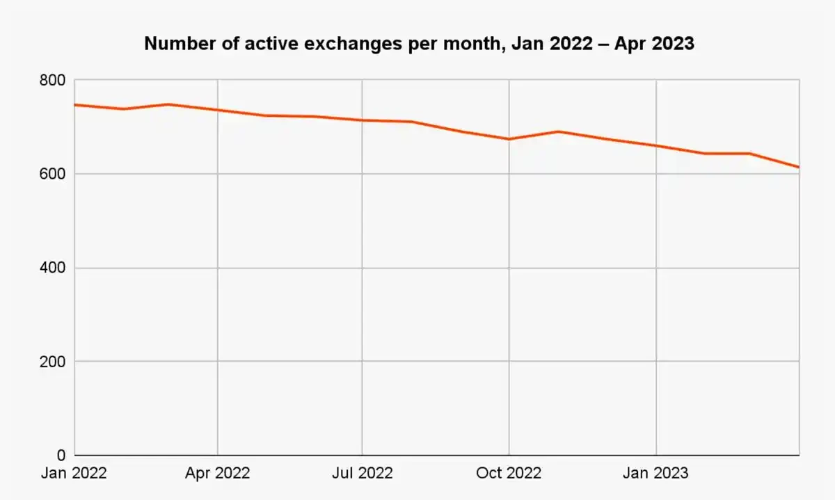 2023 年加密货币市场解冻,比特币价格上涨超过 50% 。但交易平台面临挑战,活跃的中心化交易平台数量从 2022 年初的 750 降至 640 。随着去中心化交易平台(DEXes)的竞争加剧,CEX 们的交易量进一步下滑。