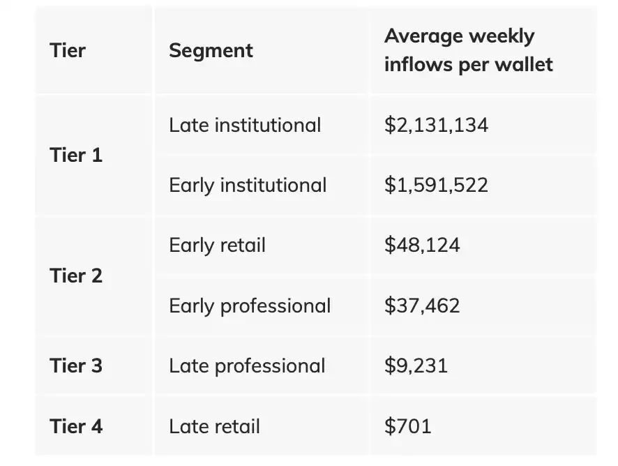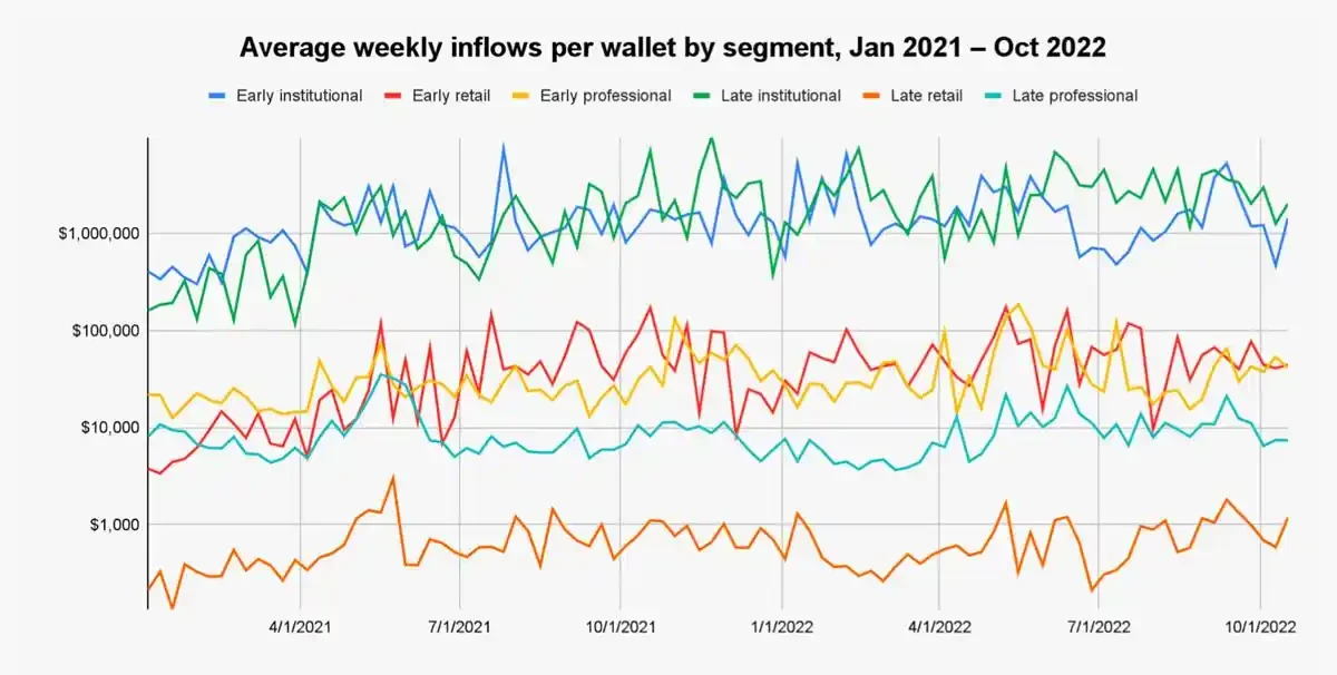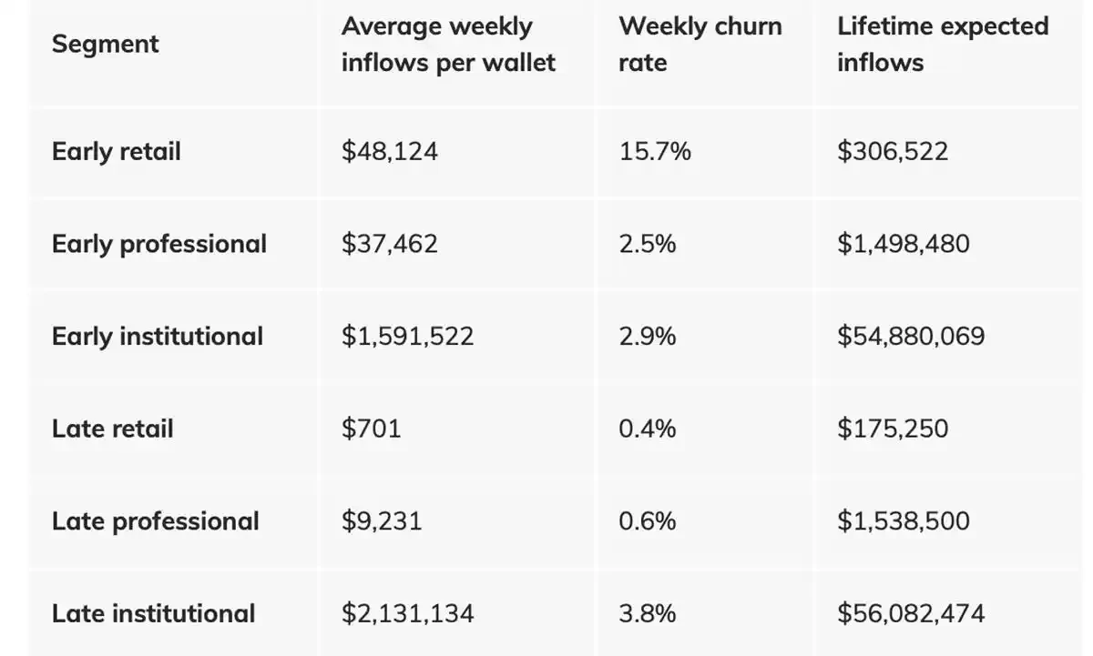- 尽管在平均每周的用户基数中只占 0.1% ,但在研究的时间段内,晚期机构钱包流入的资金量占总量的 30.0% ;