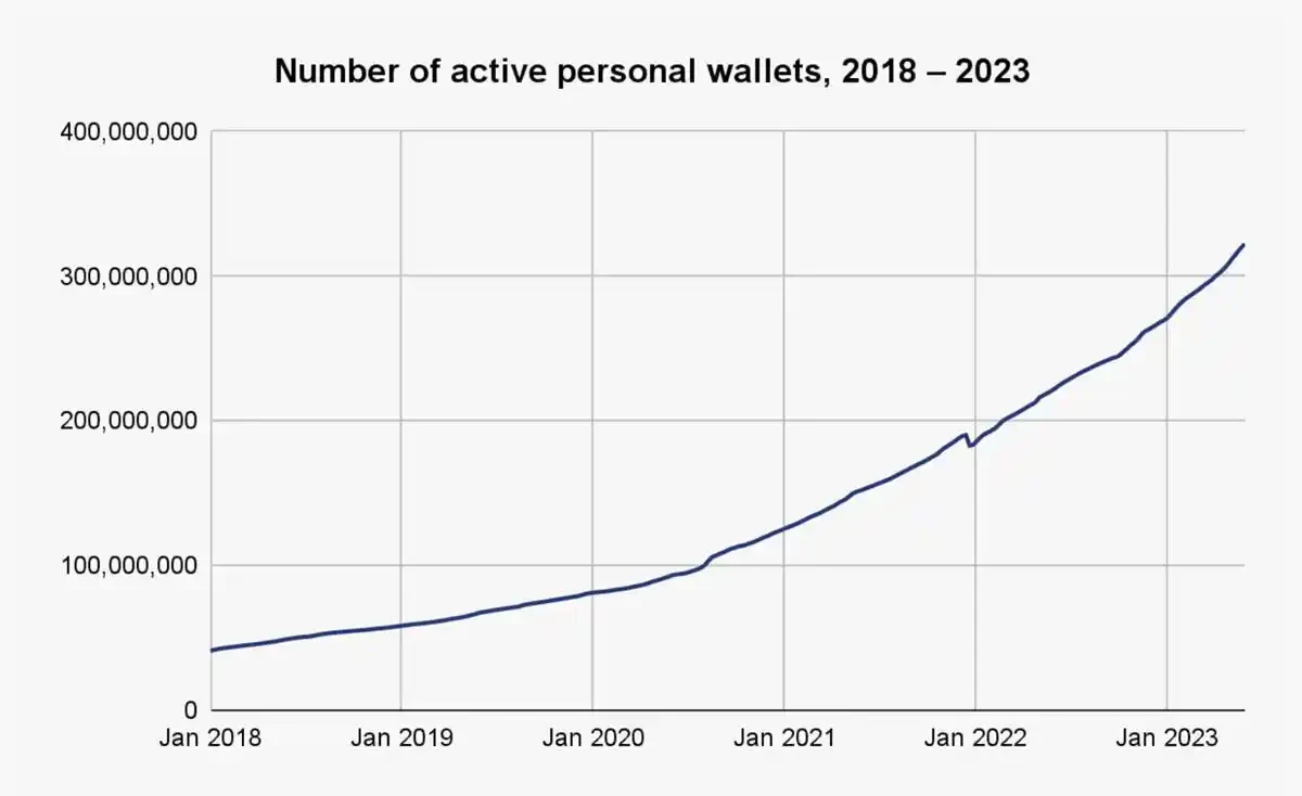 深潮注:下图显示,个人活跃钱包数量从 2018 年的 5000 万个左右,涨到了现在的 3 亿多个。但原报告并未披露这类地址的计算方式,如是否去重等。