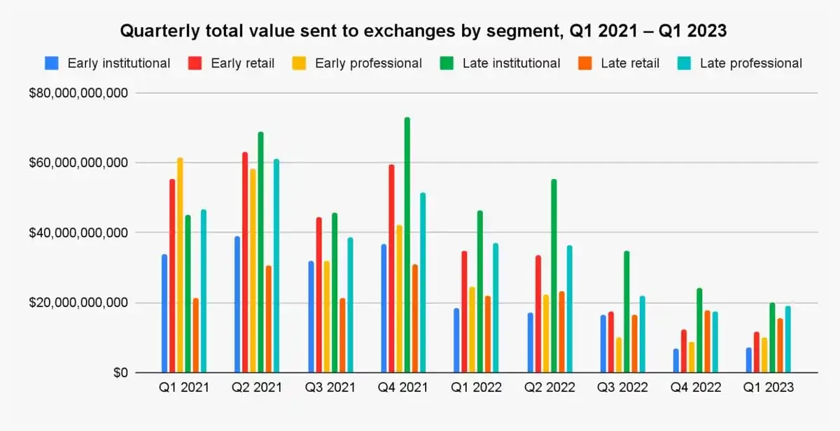 总的来说,大部分季度中,各个群体向交易平台发送的价值基本持平,除了晚期零售钱包和早期机构钱包,它们在这个时间段内向交易平台发送的总价值分别占 11.4% 和 11.9% 。