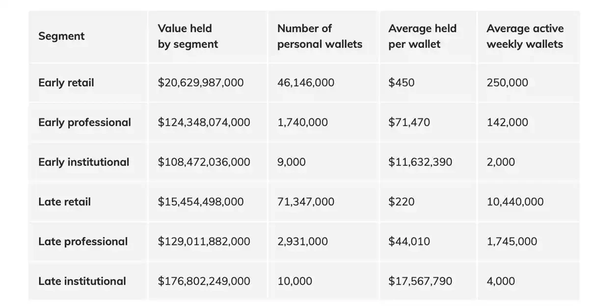 该报告基于所有能够搜集到的钱包,考虑钱包的年龄和其中的资产持有量,将用户分为 6 个部分:早期零售、早期专业、早期机构、晚期零售、晚期专业和晚期机构。