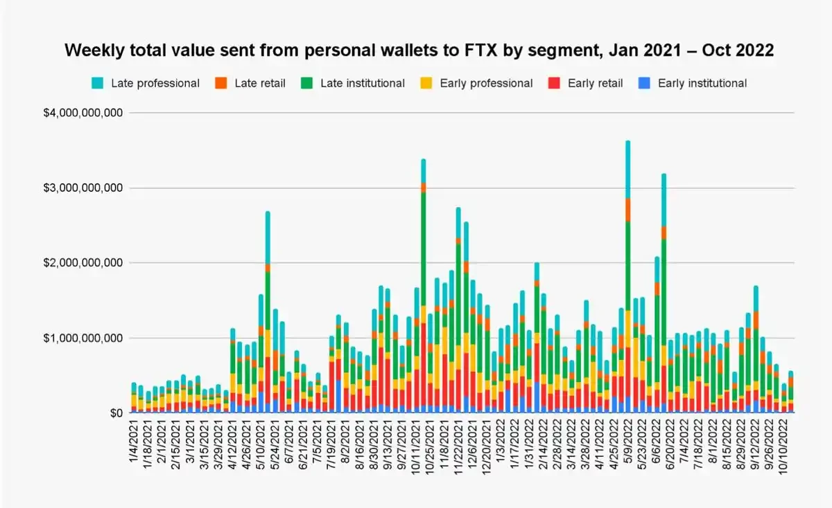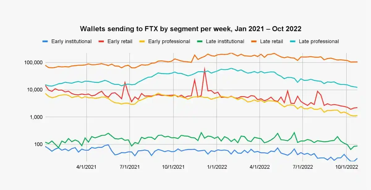 从绝对数量上来看,在 FTX 里晚期零售钱包构成了用户基础的绝大部分,且晚期专业钱包几乎每周都是第二大群体。