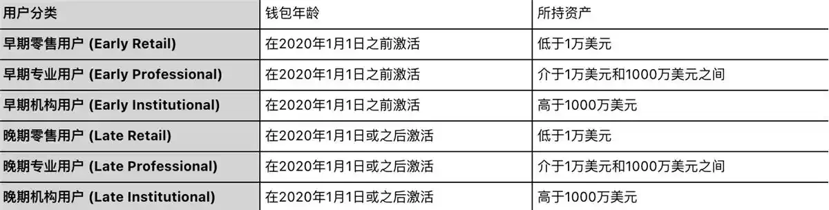 1. 用户分层:根据钱包的年龄和资产持有量,用户可分为早期零售、早期专业、早期机构、晚期零售、晚期专业和晚期机构 6 类。零售用户(散户)地址总数上亿,但加起来的资产数量不如机构。