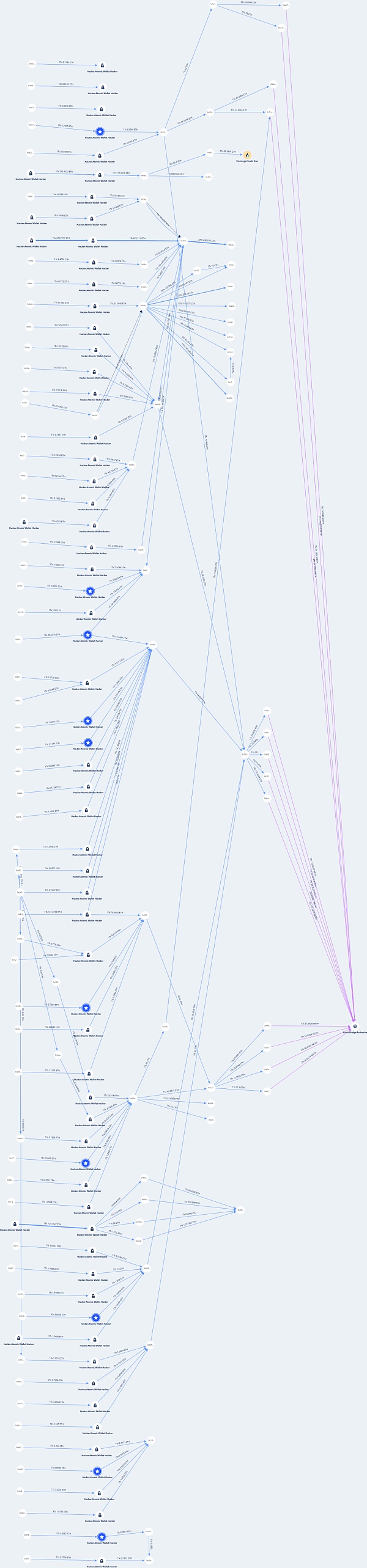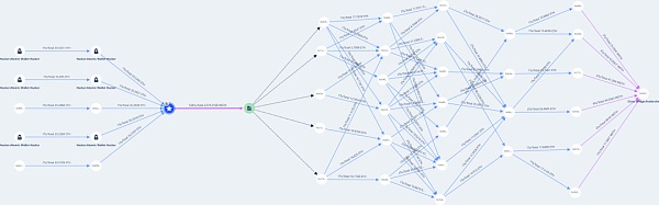 与其他链类似,被盗钱包资金会直接转入黑客地址,再由黑客控制经一层中转转入汇聚地址并在之后进行发散。发散层数至少4层,之后会进行沉淀或混入更大流水的疑似洗钱地址。