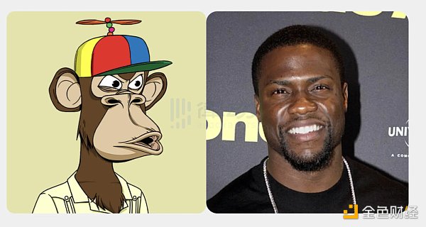 和吉米一样,知名喜剧演员凯文·哈特于 2022 年 1 月 26 日,在 Moonpay 的帮助下进行首次 NFT 购买。支付了 79.5 ETH(当时约为 20 万美元)后,凯文·哈特得到了编号为 #9258 的 BAYC「无聊猿」NFT,顶着一顶充满活力的五彩帽子,上面有一个风车。以当前的地板价 38ETH 来计算,凯文·哈特的浮亏约为 13 万美元。