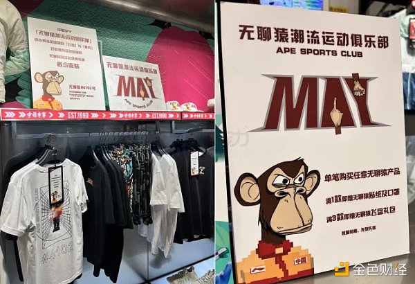 为了丰富消费体验和产品设计,中国李宁将其购买的「无聊猿」Bored Ape Yacht Club #4102 形象带入品牌创新设计中,推出了一系列融合了像素风和街头风元素的「无聊猿」潮流运动服装。同时如前文所说,中国李宁还特别在实体店中设立了以「无聊不无聊」为主题的快闪店。