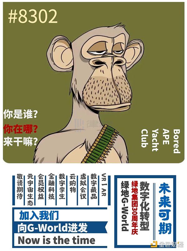 根据链上的数据显示,绿地集团以 140ETH(当时的价值约为 40 万美元)购买了编号为 #8302 的 BAYC「无聊猿」NFT。绿地集团购买的「无聊猿」BAYC 编号 8302 有着特别的寓意:其中"8"的发音与「把」相近,"30"代表绿地集团成立 30 周年的纪念,而"2"则象征着这是绿地集团二次创业的新起点。