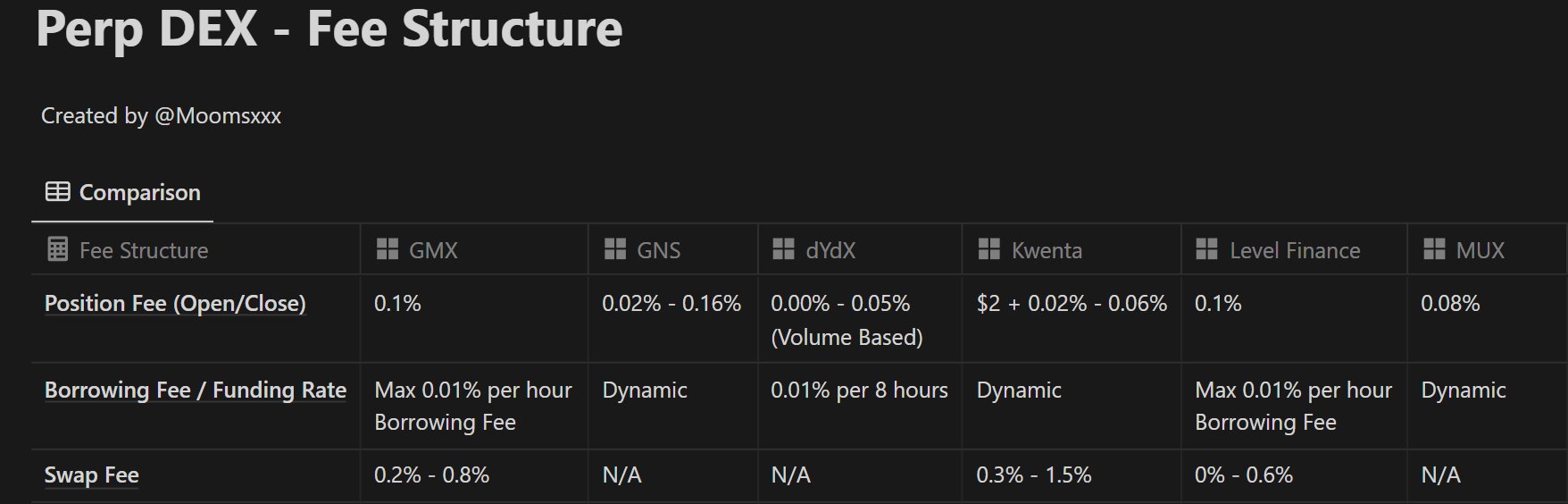 资金费率:dYdX 为每 8 小时为 0.01% ;GMX 和 Level 每小时最大为 0.01% ;GNS、Kwenta 和 MUX 均为动态。