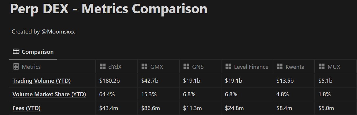 另一方面,GMX 目前收取的费用最高,但他们正在努力解决这个问题。然而,有趣的是,GMX 的交易量约为 dYdX 的五分之一,但产生的费用约是 dYdX 的 2 倍。