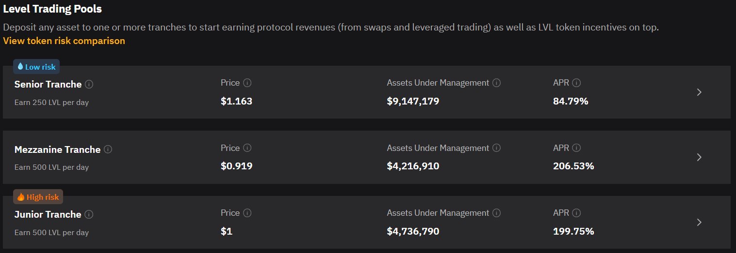 Level 于 2022 年 12 月推出,提供 BTC、ETH 和 BNB 的现货和杠杆交易(高达 50 倍)。Level 获得巨大关注的原因在于其“忠诚度计划”,该计划每天奖励交易者 1.6 万枚 LVL 。许多交易量和费用来自该计划,通过三档模式,用户可以从其资产中赚取 85% 至 206% 的年利率。矿工可以选择是否将资产存入风险较低的池中并赚取较少的年利率,反之亦然。