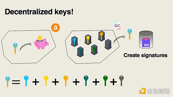 私钥分为不同的份额。这些共享分布在节点上。生成有效的签名需要足够的节点同意,使用称为阈值 ECDSA 的方法。根据记录,ECDSA是比特币中用于生成密钥对的流行算法。