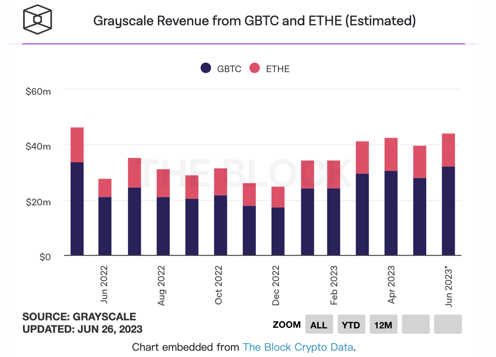 博链财经BroadChain获悉,6月27日,据 The Block, 数据显示, 2023年6月, 预计灰度(Grayscale)已从GBTC和 ETH E中获得大约4413万美元的收入,这是自2022年5月以来收入表现最好的一个月。