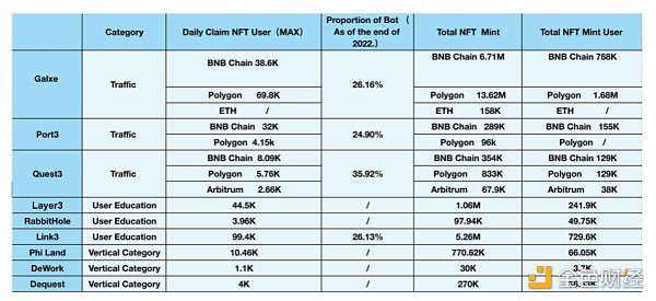 根据数据显示,不同平台之间的用户流量存在巨大差异。其中,Galxe凭借先发优势和多链布局,在早期市场占据了独一无二的地位,其它项目则属于第二梯队。
