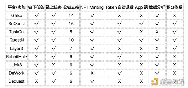从运营的角度来看,这些 Web3 任务平台的功能存在重叠。它们基本上都包括了链上任务、链下任务、奖励分发、数据分析和场景覆盖等 5 个模块。总的来说,各平台的功能点差异不大,整体呈现多场景覆盖的情况,以链下验证为主,链上验证为辅。它们各自的可替代性强。