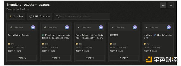 在SoQuest中,我们通过对接外部应用,实现更多运营场景的覆盖。引入的新场景必须带有社交属性,这样才能够增强项目和用户之间的关联。最近,SoQuest和Famlive达成战略合作,将Twitter Space的场景完全接入。我们扫描全网Crypto相关的所有Twitter Space,用户可以参加自己感兴趣的频道,并在Twitter Space中聊天、交互