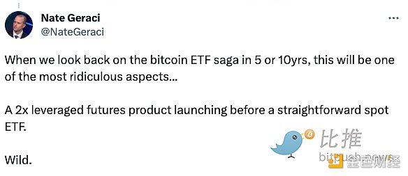 一位 Twitter 用户讽刺道:“是的,2 倍比特币期货确实保护了投资者”。ETF Institute 联合创始人 Nate Geraci 发推文称:“这将是 5 到 10 年内比特币 ETF 故事中最荒谬的桥段之一……在简单的现货 ETF 之前推出 2 倍杠杆期货产品,很狂野”。