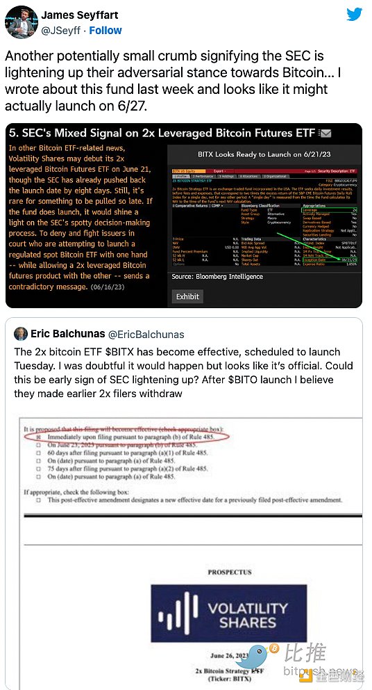 彭博资讯 ETF 分析师 James Seyffart 和Eric Balchunas在推文中表示,美国证券交易委员会愿意允许杠杆比特币期货 ETF 可能预示着比特币产品“看到了希望”。