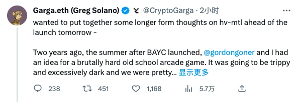 6 月 28 日晚,即「HV-MTL Forge」上线的前夜,Yuga Labs 联合创始人 Garge.eth 于个人推特发布了一篇长文,谈及了关于该游戏、更早的「Dookey Dash 」,以及 Yuga Labs 游戏开发规划的一些所思所想。