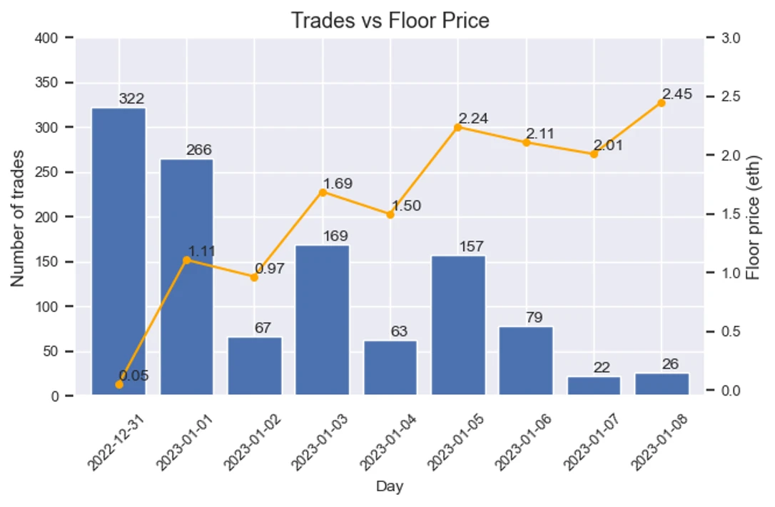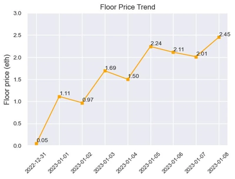 我们想要了解为什么该系列在 2022 年 12 月 31 日推出第一周后,地板价从 0.05 E 激增至 2.5 E(增长了 5000% !)。在研究数据后,我们发现: