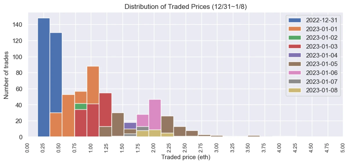 为了验证这个假设,我们进一步研究了第一周内发生的所有交易的价格分布。如下图所示(不同颜色代表不同日期的交易),每天的交易几乎都发生在当天的地板价以下。这个发现很有意思,因为拉高地板价到目标位置的最直接的方法就是扫掉所有低于目标价格的挂单。这是另一种表明背后存在有组织的价格操纵行为的信号。