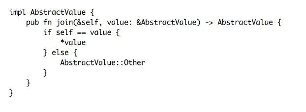在 AbstractValue::join 中,该函数将其值与另一个 AbstractValue 进行比较。如果它们相等,它将返回传入的值。如果不相等,则返回 AbstractValue::Other。