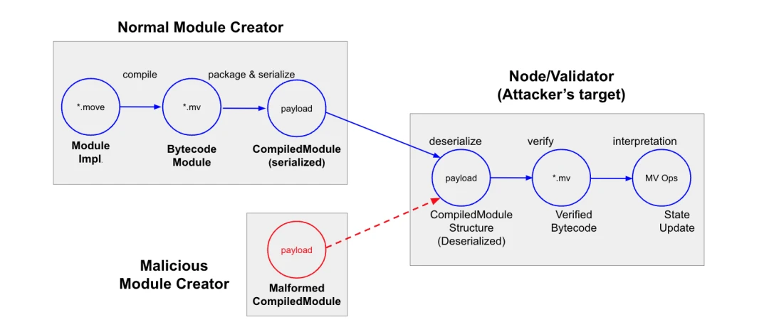 这些交易证书是 Sui 网络运作的基本组成部分,可以在在网络中的各个验证节点之间传播。对于合约创建/升级交易,在其可以上链之前,验证节点会调用 Sui 验证器检查并验证这些证书的合约结构/语义的有效性。正是在这个关键的验证阶段,“死循环”漏洞可以被触发利用。