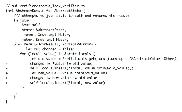 为了消除上述的不一致,Sui 的修复包括对 AbstractState::join 函数的一个微小但关键的调整。这个补丁移除了在执行 AbstractValue::join 之前判定状态合并结果的逻辑,取而代之的是首先执行 AbstractValue::join 函数进行状态合并,通过比较最终更新结果和原始状态值(old_value)来设置合并是否发生变化的标记。
