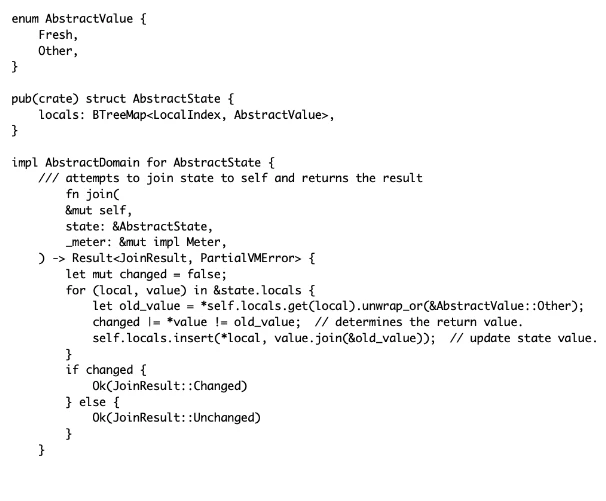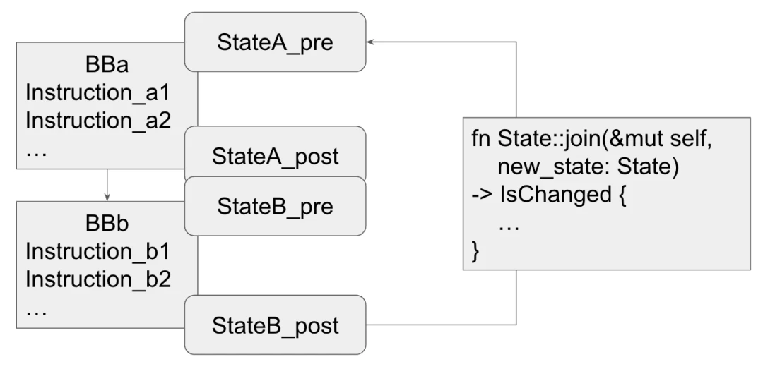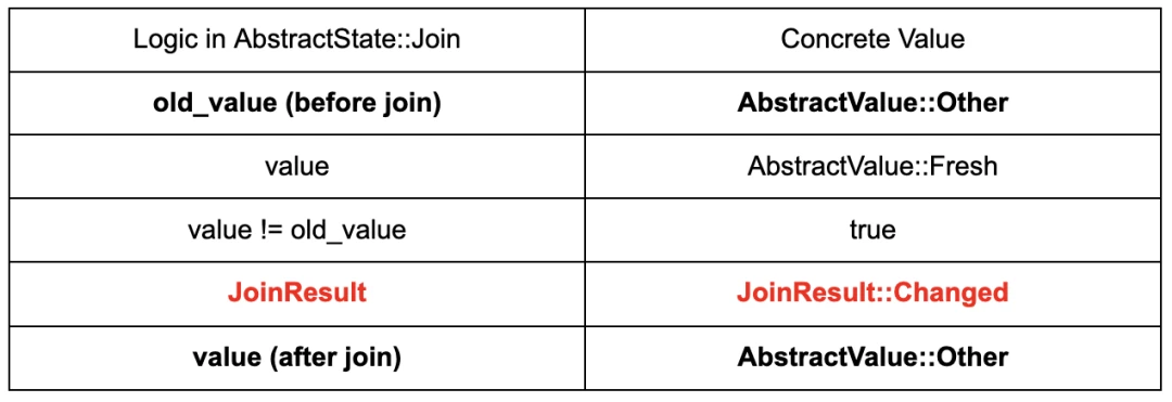 此外,在 AbstractValue::join 中,AbstractValue::Other 对合并的结果起着决定性作用。例如,如果旧值是 AbstractValue::Other,而新值是 AbstractValue::Fresh,则更新的状态值仍然是 AbstractValue::Other,即便新旧值不同,更新后状态本身没有变化。
