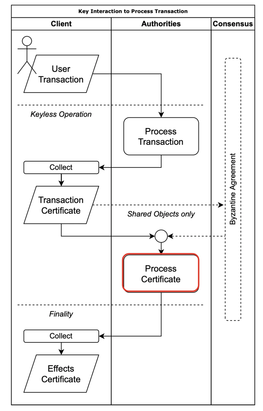 最初,用户交易通过前端 RPC 提交,经基本验证后传递到后端服务。Sui 后端服务负责进一步验证传入的交易载荷。在成功验证了用户的签名后,交易被转化为交易证书(包含交易信息以及 Sui 的签名)。