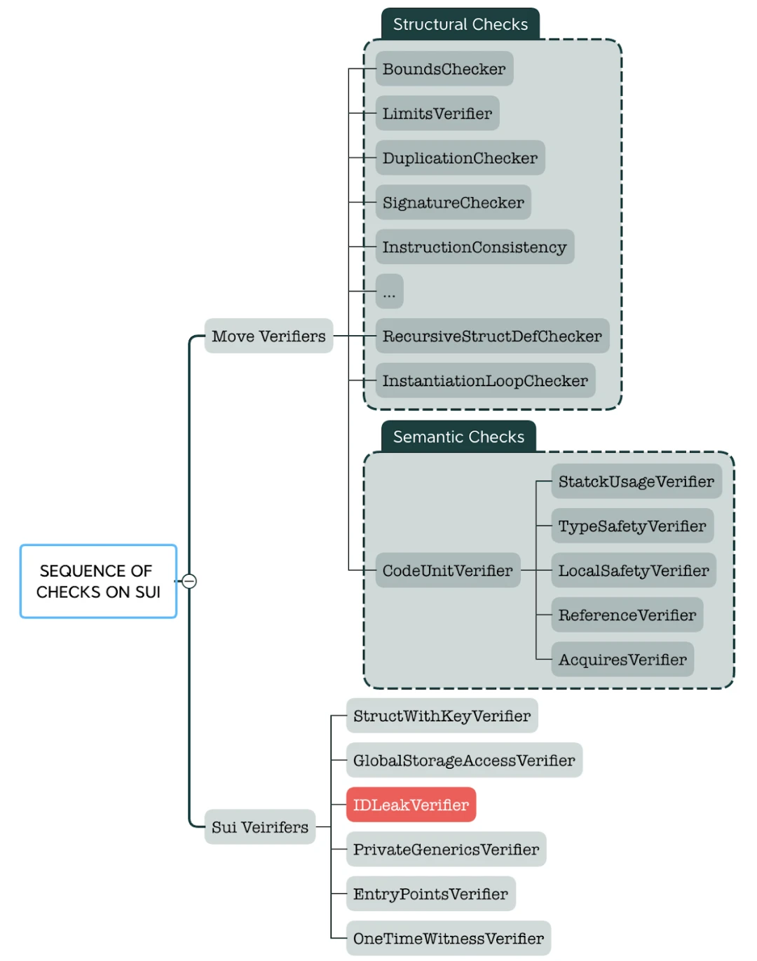 如 Sui 和 Aptos 这样基于 Move 语言的区块链,其防止恶意载荷攻击的保障机制主要是静态验证技术。通过静态验证技术,Sui 可在合约发布或升级之前检查用户提交的载荷有效性。验证器提供了一系列检查器用来确保结构和语义的正确性,只有当通过检查验证后,合约才会进入 Move 虚拟机被执行。