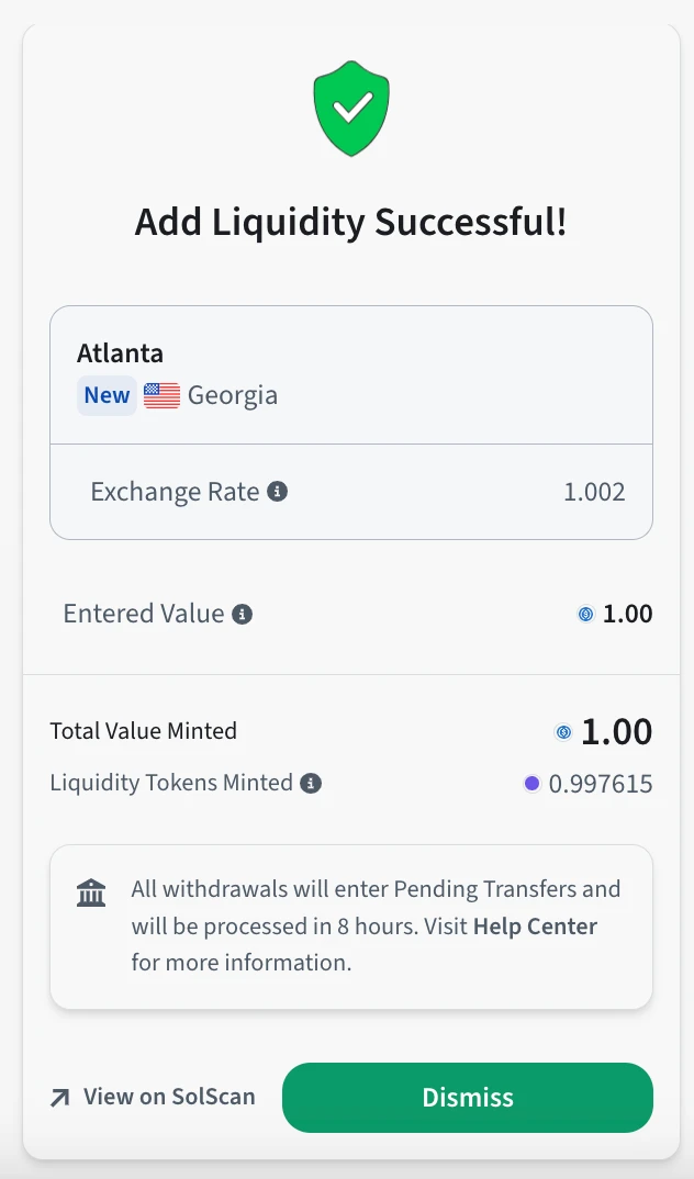 查看订单、单击提交并批准 Solana 钱包中的交易后,用户可以看到确认组件: