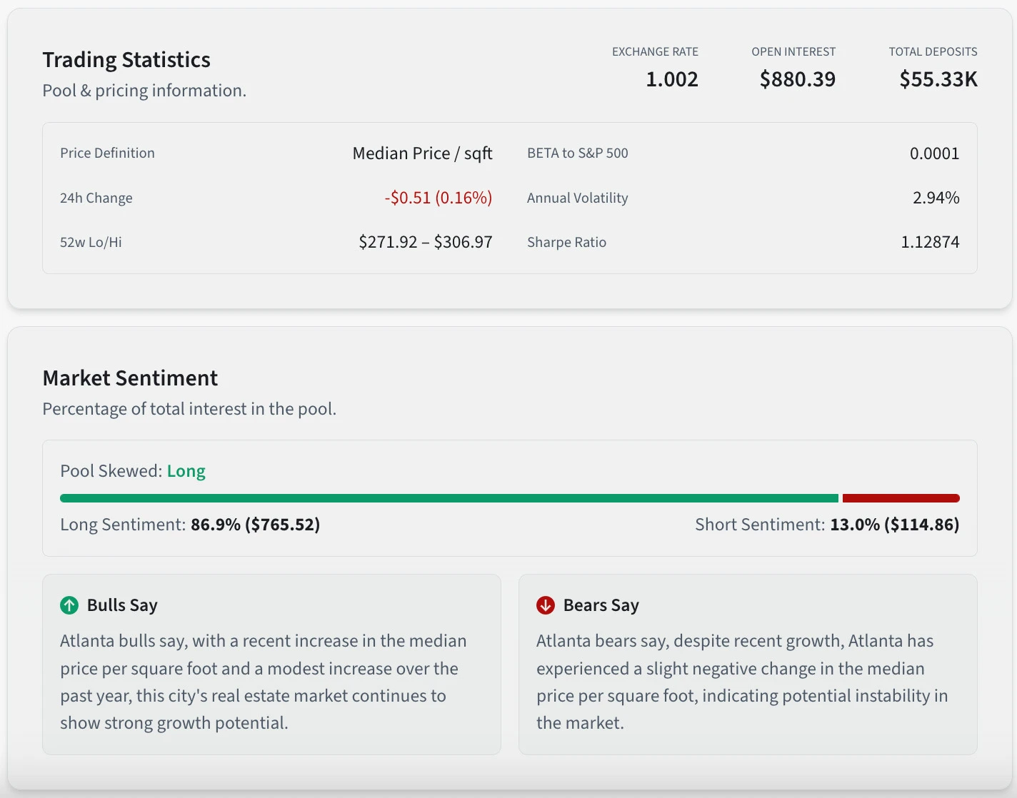 Parcl DApp 为用户提供与该指数相关的所有数据,包括关键的交易统计数据(就像在股票交易所购买房地产投资信托股票时一样),以及市场情绪。这个市场情绪功能非常有趣,因为它允许用户阅读从看涨和看跌方向的论证。