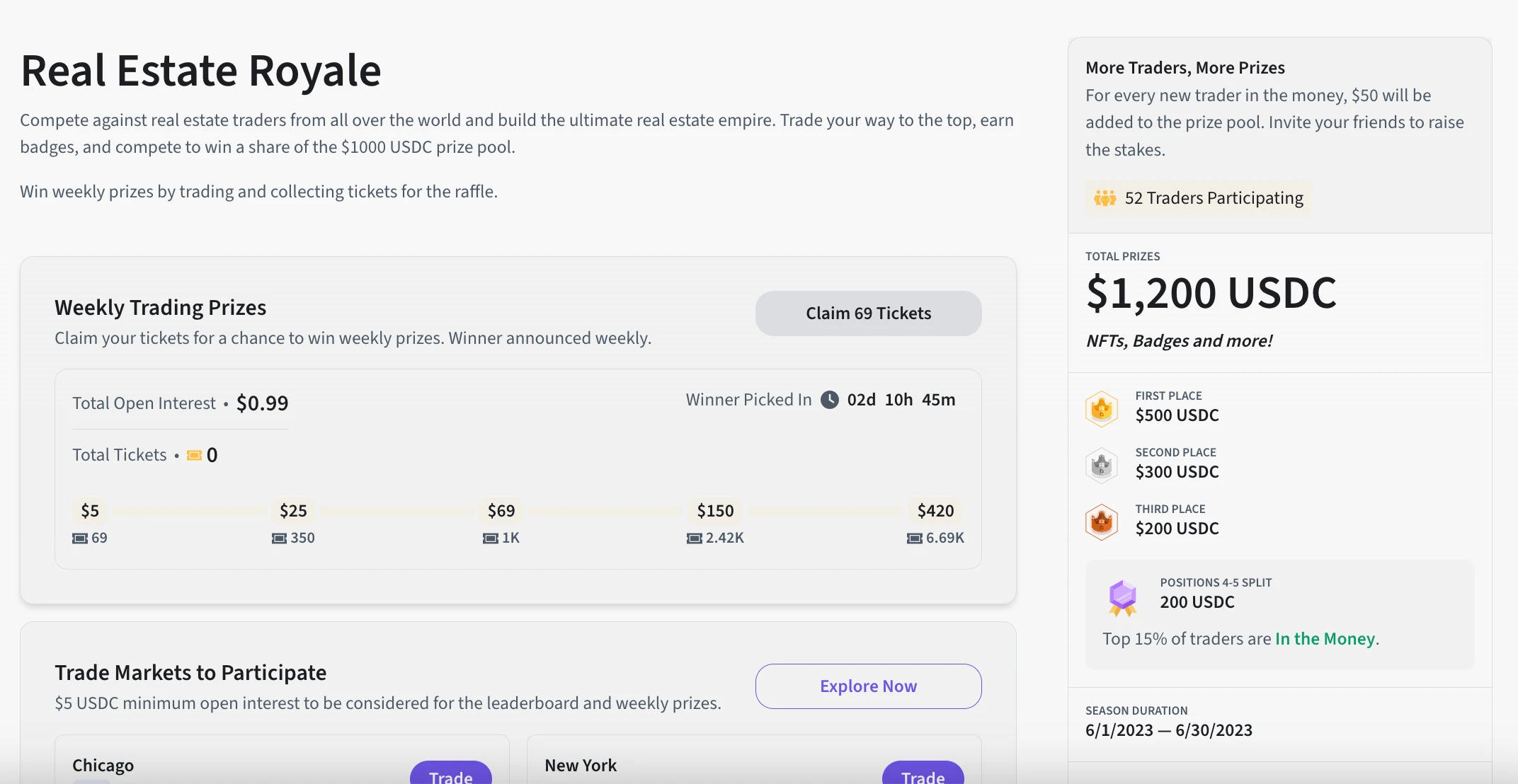 用户还可以访问竞赛页面,在 Parcl 上参与交易活动。人们可以与其他 Parcl 用户竞争,以赢取奖品,包括现金(USDC)奖品、NFT、徽章等。人们还可以查看竞赛的奖品、时间段、规则、每周统计和排行榜。然而,“最大化您的潜力”只适用于高级用户。在撰写本文时,Real Estate Royale 第三季的活动正在进行中。