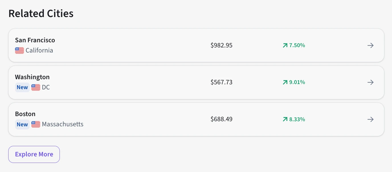 撰写时,Parcl 提供对大部分美国顶级房地产市场的访问,包括纽约、波士顿、费城、旧金山、洛杉矶、华盛顿、芝加哥、亚特兰大、西雅图、丹佛、拉斯维加斯、迈阿密海滩和凤凰城。