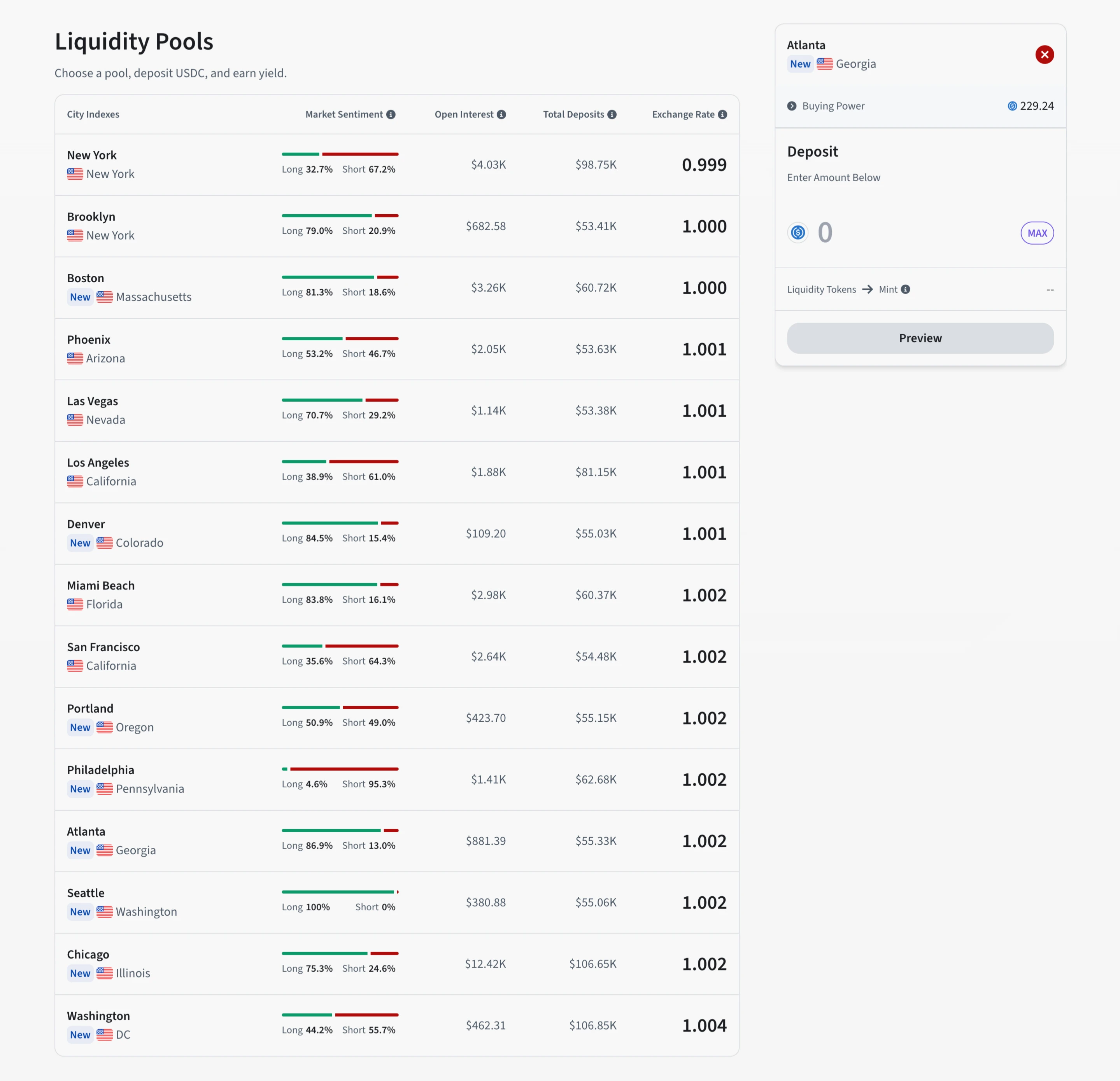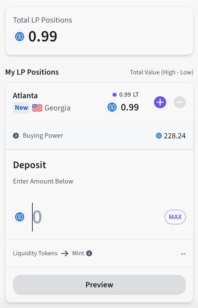 成功链接钱包并建立仓位之后,用户能导航到流动性池(Liquidity Pools)标签页。 我再次选择以亚特兰大作为案例: