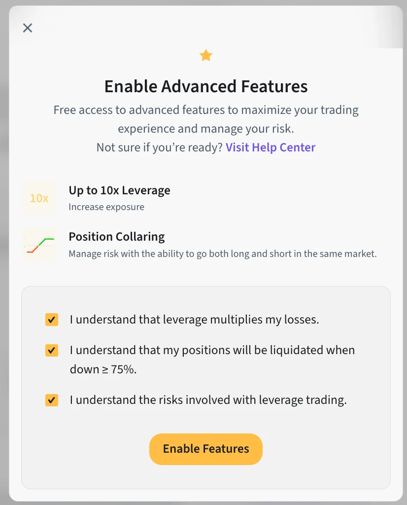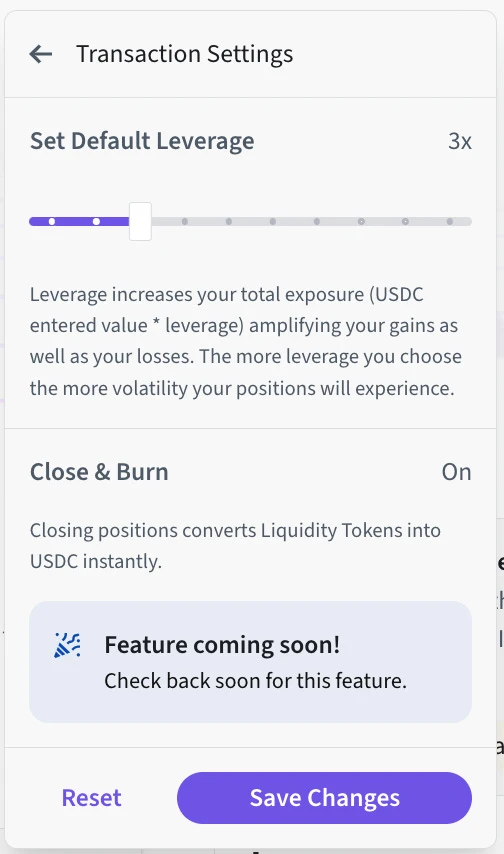 点击“Enable Features(启用功能)”后,用户现在可以在钱包窗口中访问交易设置面板。在这里,用户可以设置他们的默认杠杆进行交易。默认情况下,关闭并燃烧是打开的,这意味着空头和多头仓位将在跌至 75% 及以下时自动清算。