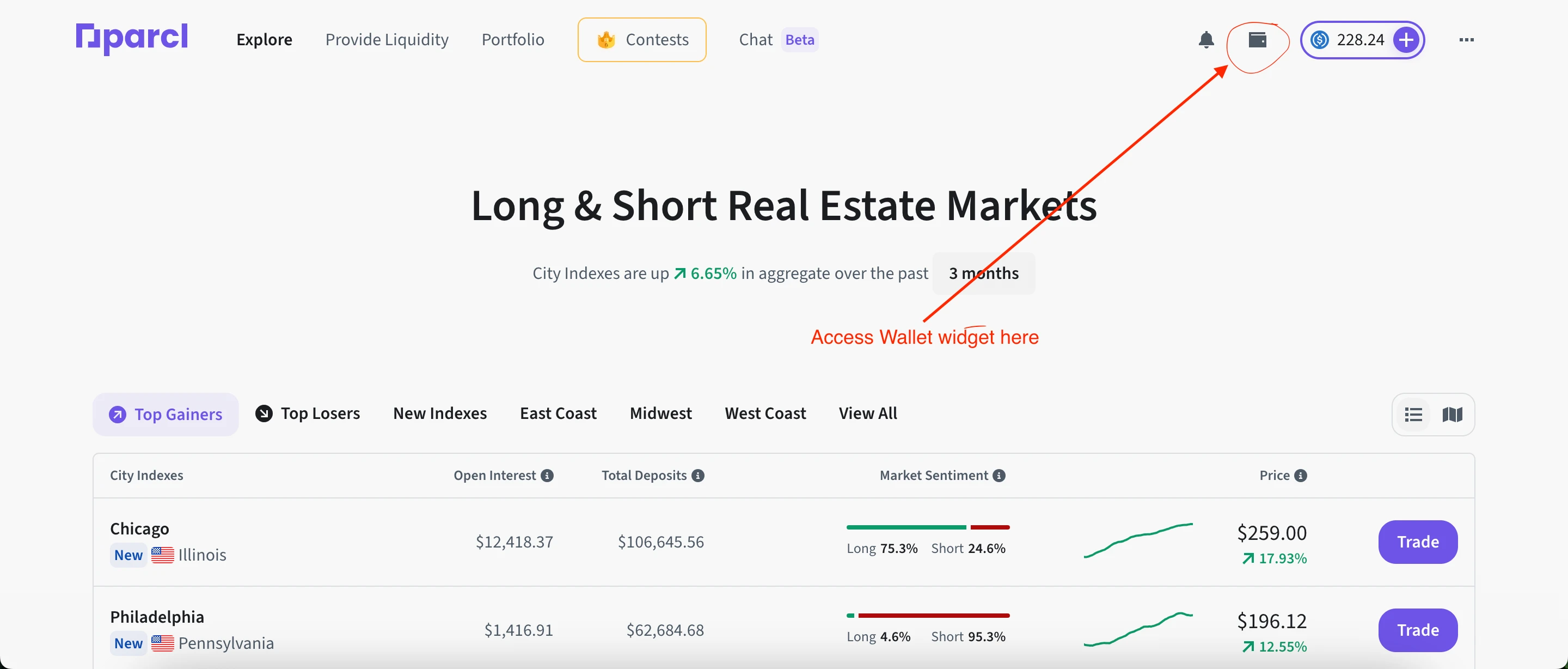 在浏览 DApp 时,不需要连接 Solana 钱包,特别是在"explore"和"trade"页面。只有当您想要开始投资时,才需要将 Solana 钱包连接到 Parcl DApp。