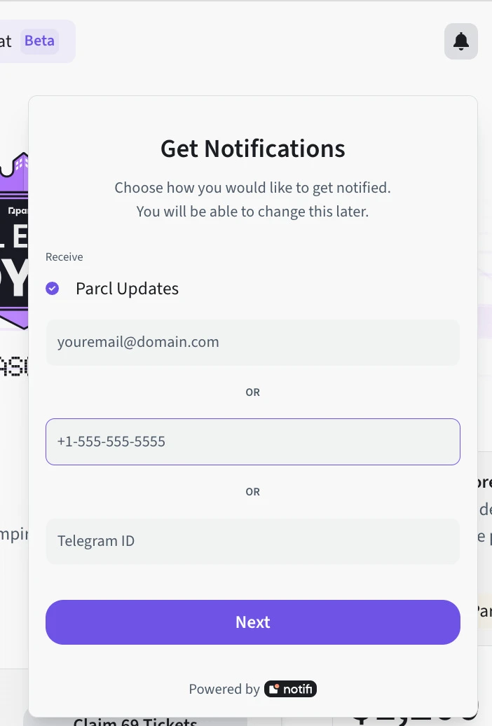 如果用户希望在他们的个人社交账户上接收更新,他们还可以注册接收通知。点击右侧的钱包图标旁边的铃铛图标将打开一个下拉窗口。用户在访问之前需要在他们的钱包中批准此操作。