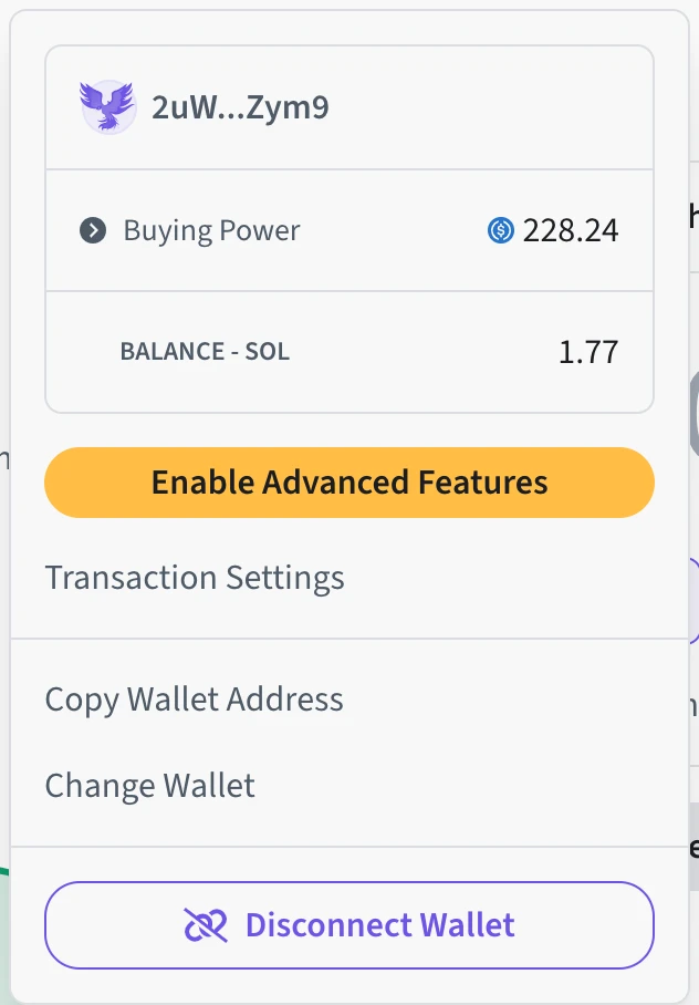 在这里,您可以像在投资组合页面上一样查看您的购买力。还有其他功能,包括交易设置(仅适用于高级功能用户)、复制钱包地址、更改钱包和断开钱包连接。更改/断开钱包只应在您需要用新的钱包替换当前连接的钱包或注销此钱包时使用。