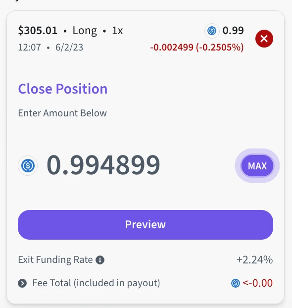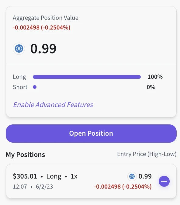 点击“Open Position”将允许用户再次进行交易。另一方面,点击“My Positions”下的仓位将展开一个面板,允许用户关闭该仓位: