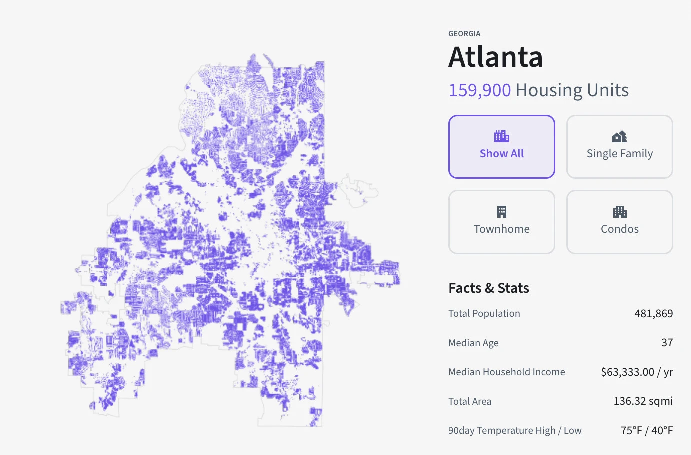 在更下面,有一个亚特兰大都会区的地图,显示了所有住房单位以及有关这个城市的基本事实和统计数据。