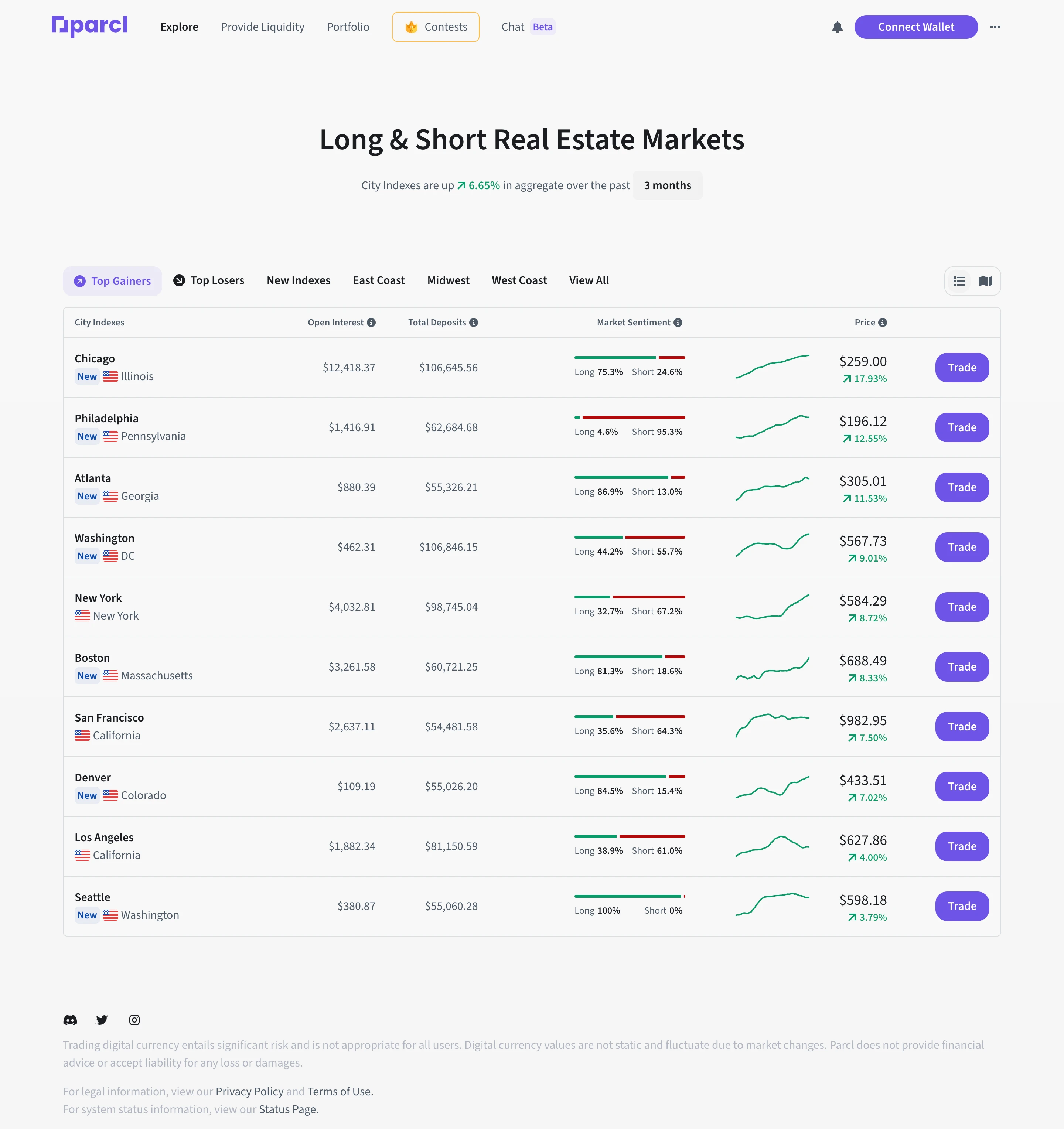 Parcl 与其他模型完全不同。最重要的是,Parcl 允许用户投资社区和城市,而不是特定的建筑物。其指数充当类似 REIT 的指数系统,代表一个城市的住宅房地产市场。