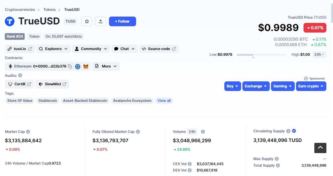 在 Prime Trust 暂停存取款后,TrueUSD 在一封电子邮件中告知与 Prime Trust 有关联账户的客户,在 Prime Trust 暂停运营期间,他们将无法铸造或兑换稳定币 TUSD。自币安开始在其平台上大力推广之下,TrueUSD 从一个名不见经传的稳定币项目走入主流视野,份额迅速增长。据 Coinmarketcap 数据显示,截至发稿时,TUSD 总发行量接近 31.4 亿美元。