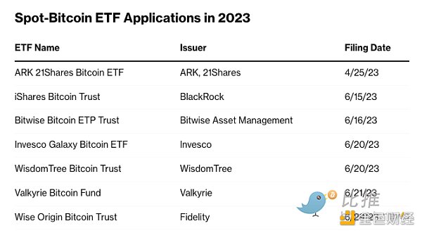 贝莱德的 ETF 申请得到了巴克莱银行前首席执行官Bob Diamond的认可,它还带动了 WisdomTree、 Invesco 和 Valkyrie 向 SEC提出新的申请,同时助力比特币价格在 2023 年 6 月重返 30,000 美元以上。