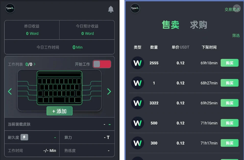 Type!t 本质上是在手机上下载类似搜狗输入法的 APP,软键盘的皮肤采用 NFT 形式发售,通过在手机上使用该输入法,可以在不同稀有度 NFT(N、R、SR、SSR)的算力容量期间挖矿。简单来说,手机打字软键盘相当于一台矿机。用户在规定挖矿时间内,赚取挖矿收益。