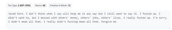 从3月18日开始至4月4日,攻击者开始陆续返还资金。期间攻击者通过链上信息进行道歉,称自己“搅乱了别人的钱,别人的工作,别人的生活”并请求大家的原谅。
