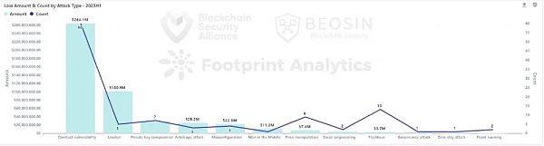 即便黑客攻击大幅放缓,合约安全问题依旧不能忽略。 2023年上半年,最频发、造成损失最多的攻击手法为合约漏洞利用。 60次合约漏洞事件造成了2.64亿美元的损失,其中绝大多数被利用的漏洞是业务逻辑问题。一些较为复杂的业务逻辑漏洞,需要经验丰富的专业审计公司才能发现。 Beosin审计团队会对每一次黑客攻击事件都会进行深入分析(推特@BeosinAlert),确保将其中总结出的经验和技术应用到项目审计过程中,以应对实际可能发生的黑客攻击。