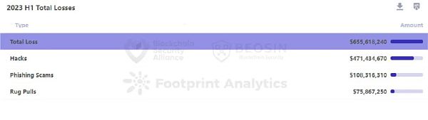 据区块链安全审计公司Beosin旗下Beosin EagleEye安全风险监控、预警与阻断平台监测, 2023年上半年Web3领域因黑客攻击、钓鱼诈骗和项目方Rug Pull造成的总损失达到了 6 亿 5561 万美元。 其中攻击事件 108 起,总损失金额约 4 亿 7143 万美元;钓鱼诈骗总损失金额约 1.08 亿美元;项目方Rug Pull事件 110 起,总损失约 7587 万美元。