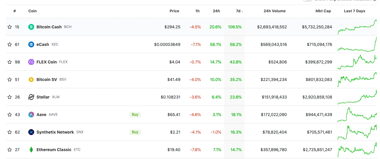 Coingecko 数据 显示,过去一周,BCH 以 106.5% 的涨幅领跑其他加密货币;过去两周,BCH 从 101 美元最高上涨至 325 美元,最高涨幅 221% ,目前暂报 294 美元。